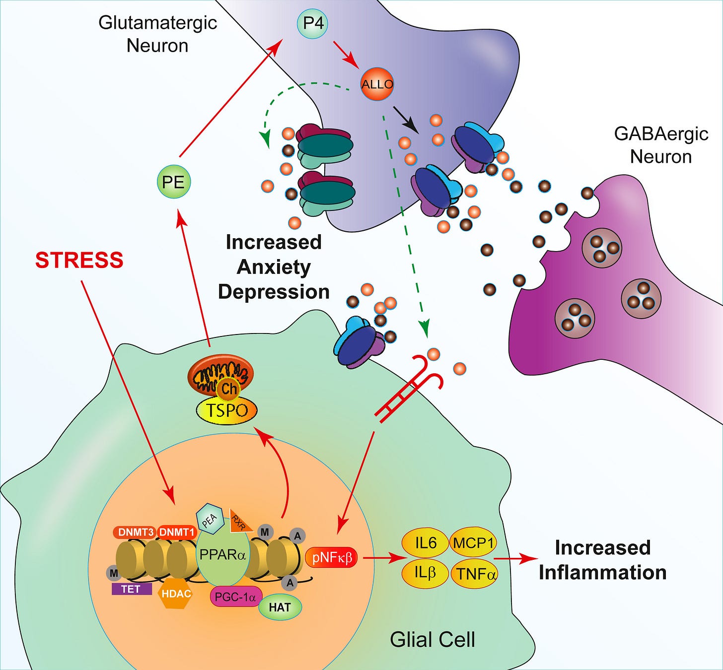 PEA → PPARα activation → increased neurosteroidogenesis → increased allopregnanolone